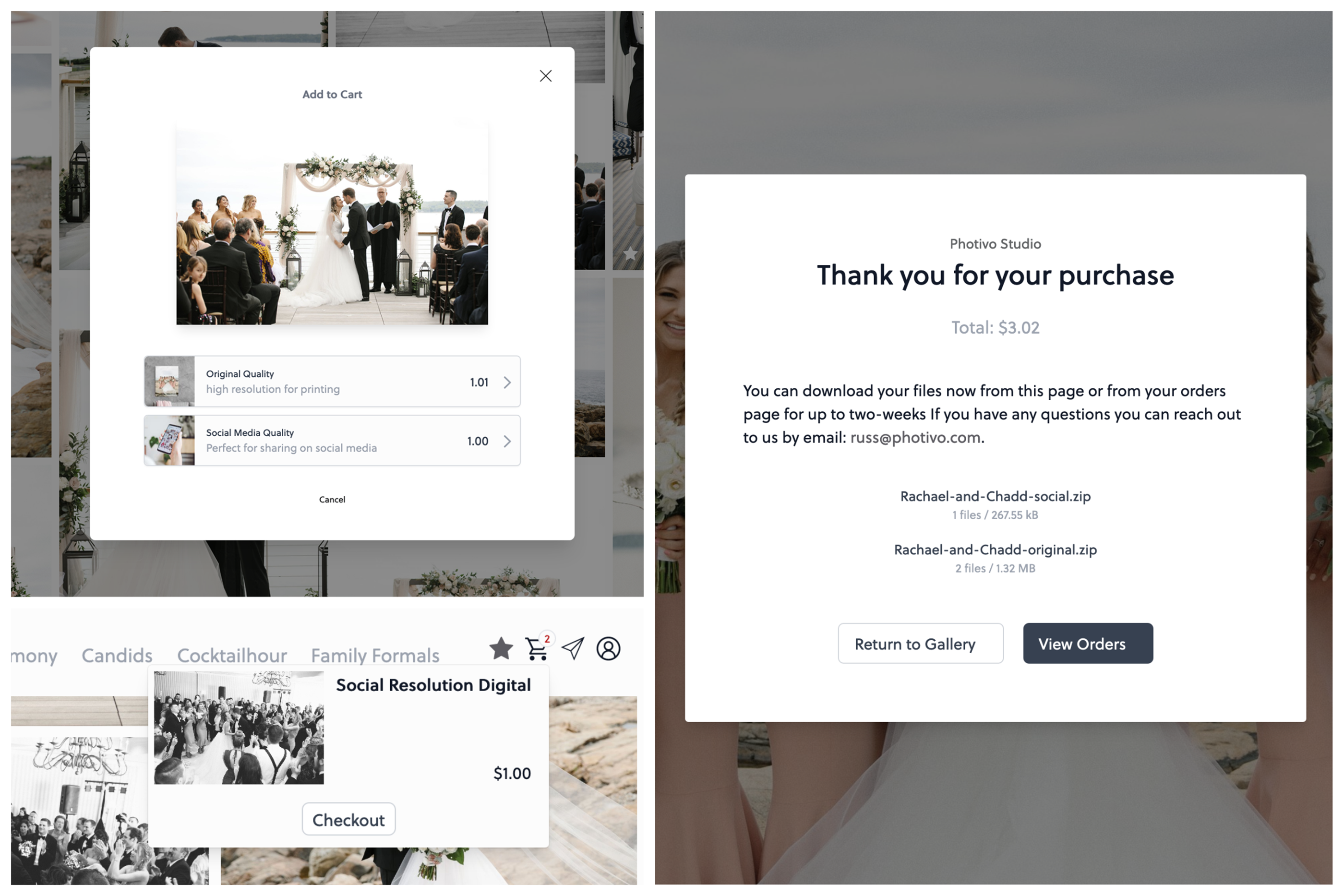 Your customer will also have a number of new screens when visiting a gallery that has the marketplace turned on. A shopping cart icon will appear on each image and they will be able to preview the price and confirm the image and add-to-cart. Upon checkout, they will get a thank you page with an opportunity to download their files or view their detailed receipt.