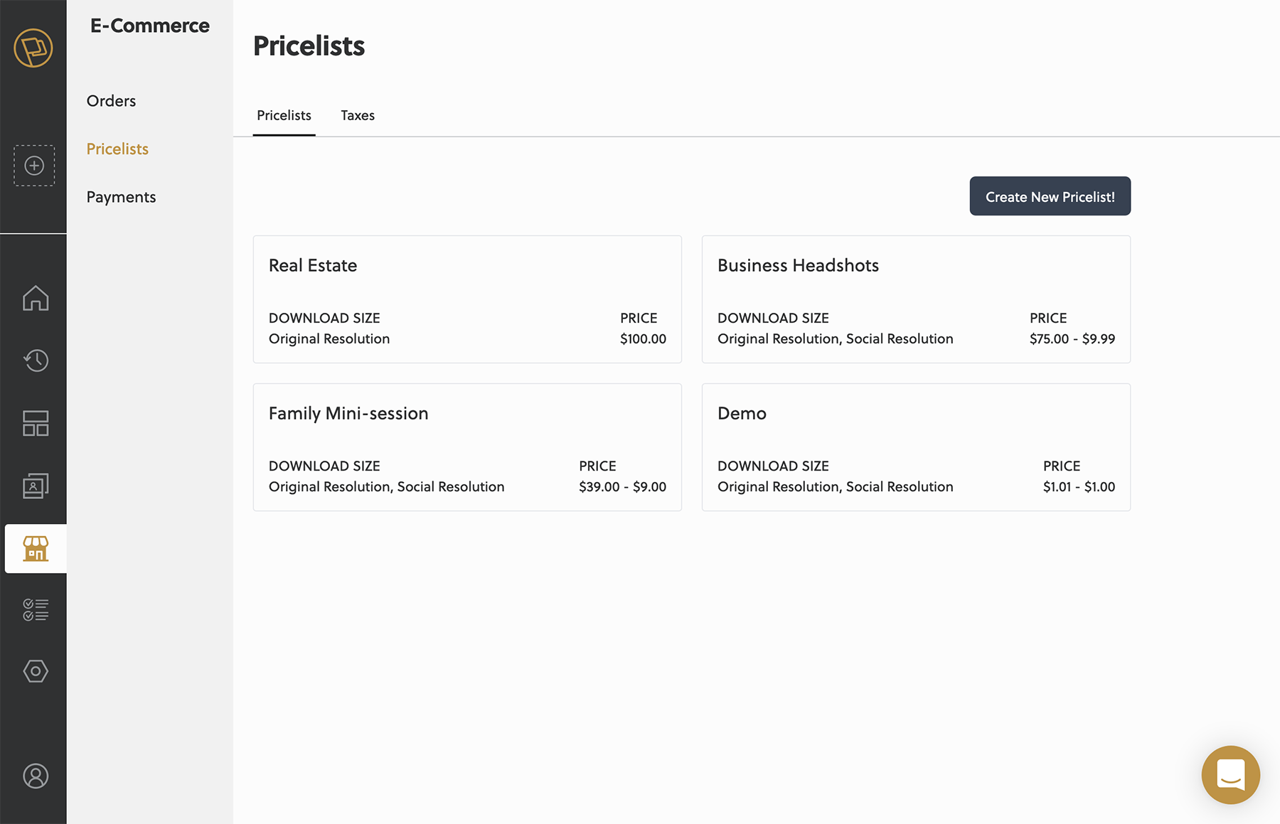 From the new price lists page, you will be able to create new price lists to be used with your galleries and set up taxes. You can reuse a pricelist on as many galleries as you want.